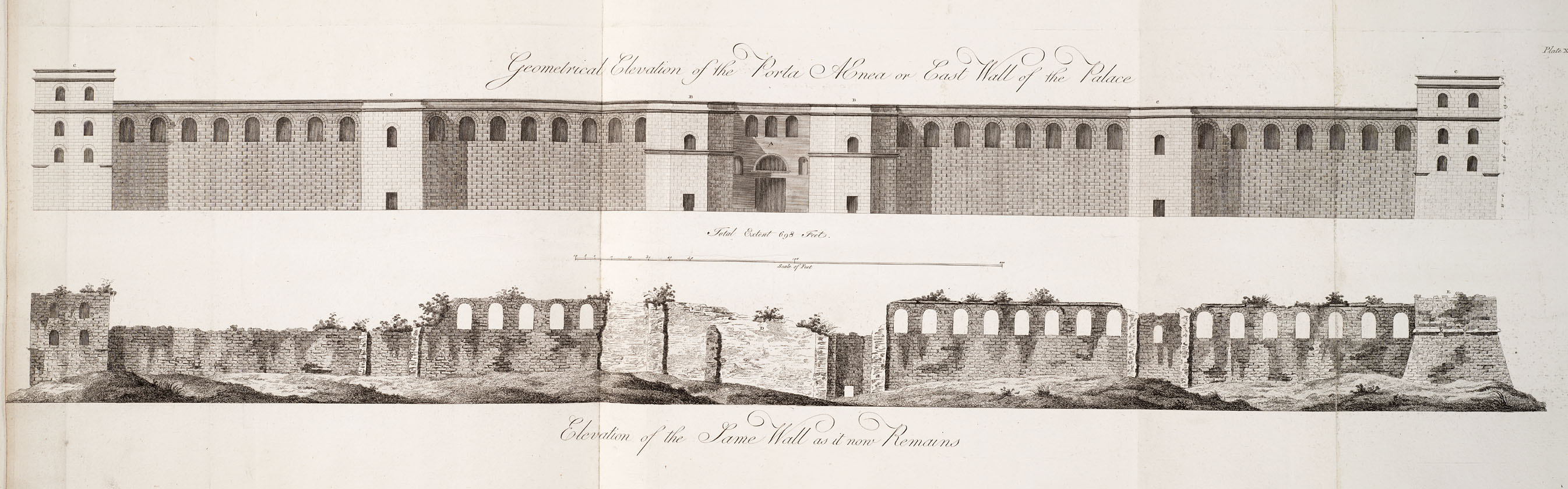 travelogue_title: Plate X. Geometrical elevation of the Porta Aenea, or the east wall of the palace, 1757, in: Adam, Robert, Ruins of the Palace of the Emperior Diocletian at Spalatro in Dalmatia, London, 1764