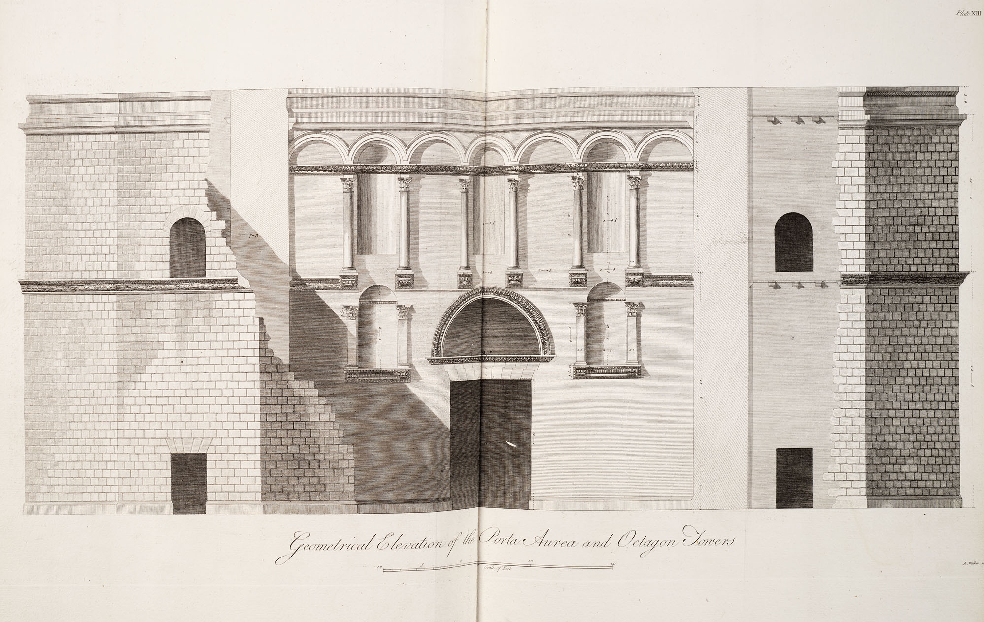 travelogue_title: Plate XIII. Geometrical elevation of the Porta Aurea and Octagon Towers, 1757, in: Adam, Robert, Ruins of the Palace of the Emperior Diocletian at Spalatro in Dalmatia, London, 1764
