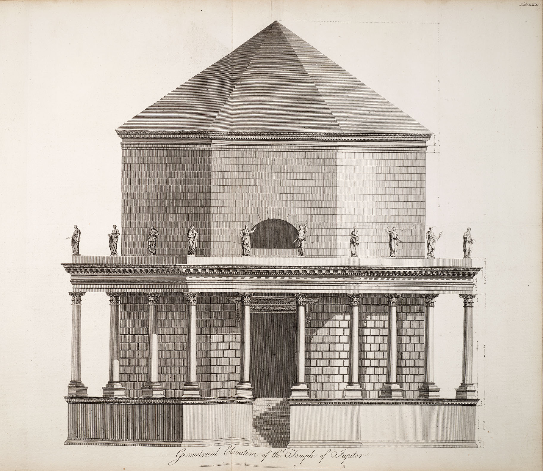 travelogue_title: Plate XXIX. Geometrical elevation of the Temple of Jupiter, 1757, in: Adam, Robert, Ruins of the Palace of the Emperior Diocletian at Spalatro in Dalmatia, London, 1764