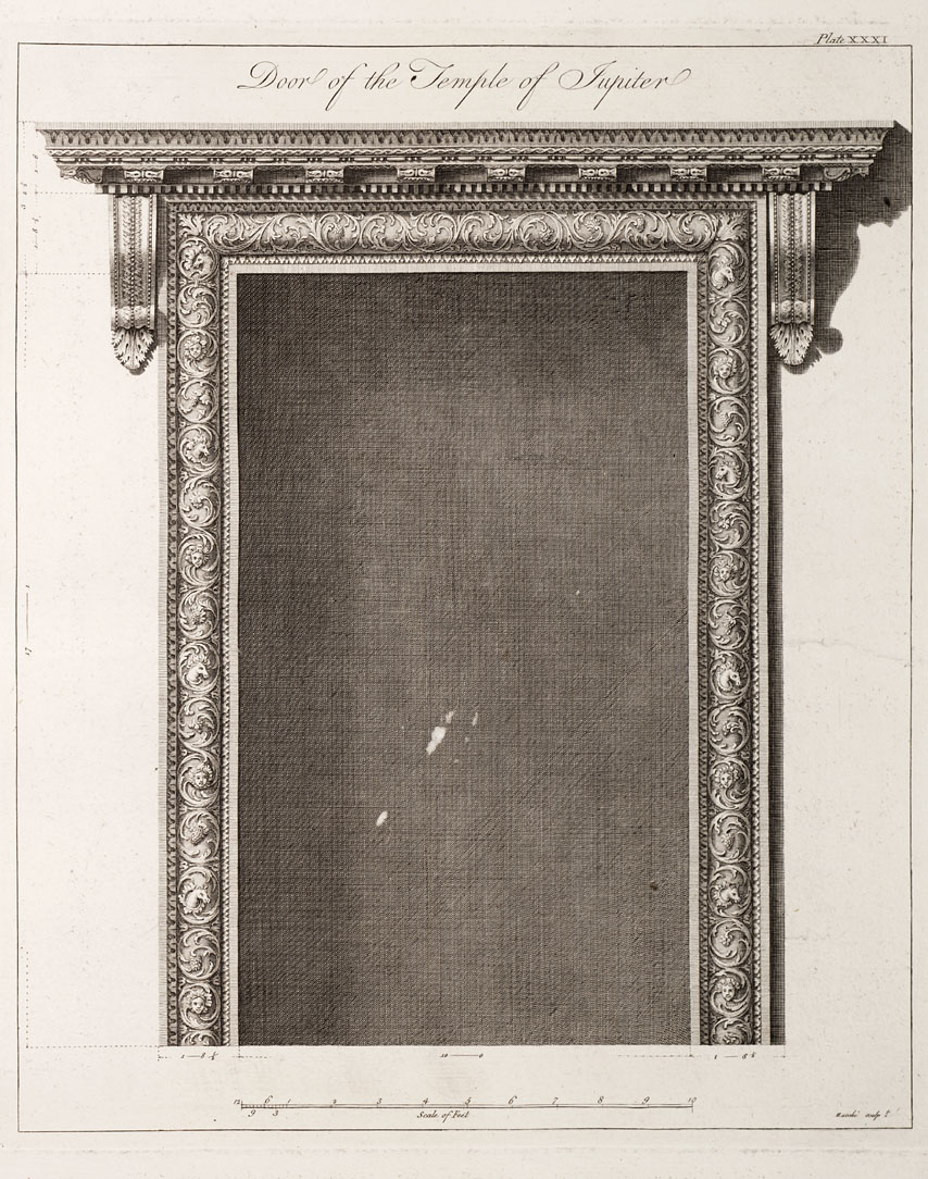 travelogue_title: Plate XXXI. Door of the Temple of Jupiter, 1757, in: Adam, Robert, Ruins of the Palace of the Emperior Diocletian at Spalatro in Dalmatia, London, 1764