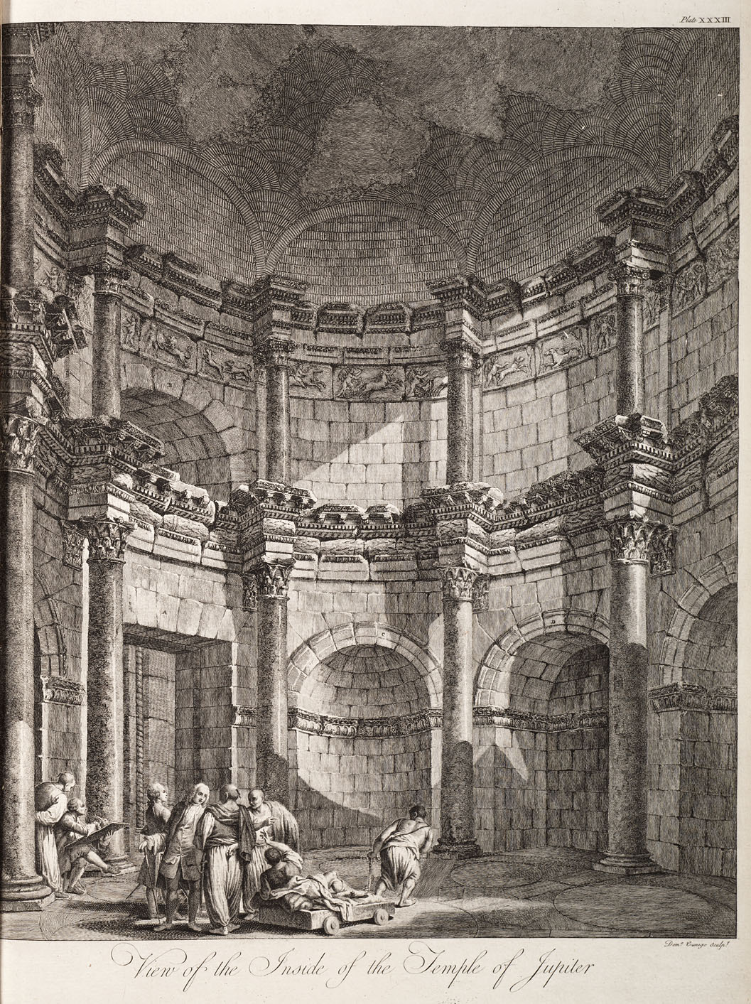 travelogue_title: Plate XXXIII. View of the inside of the Temple of Jupiter, 1757, in: Adam, Robert, Ruins of the Palace of the Emperior Diocletian at Spalatro in Dalmatia, London, 1764